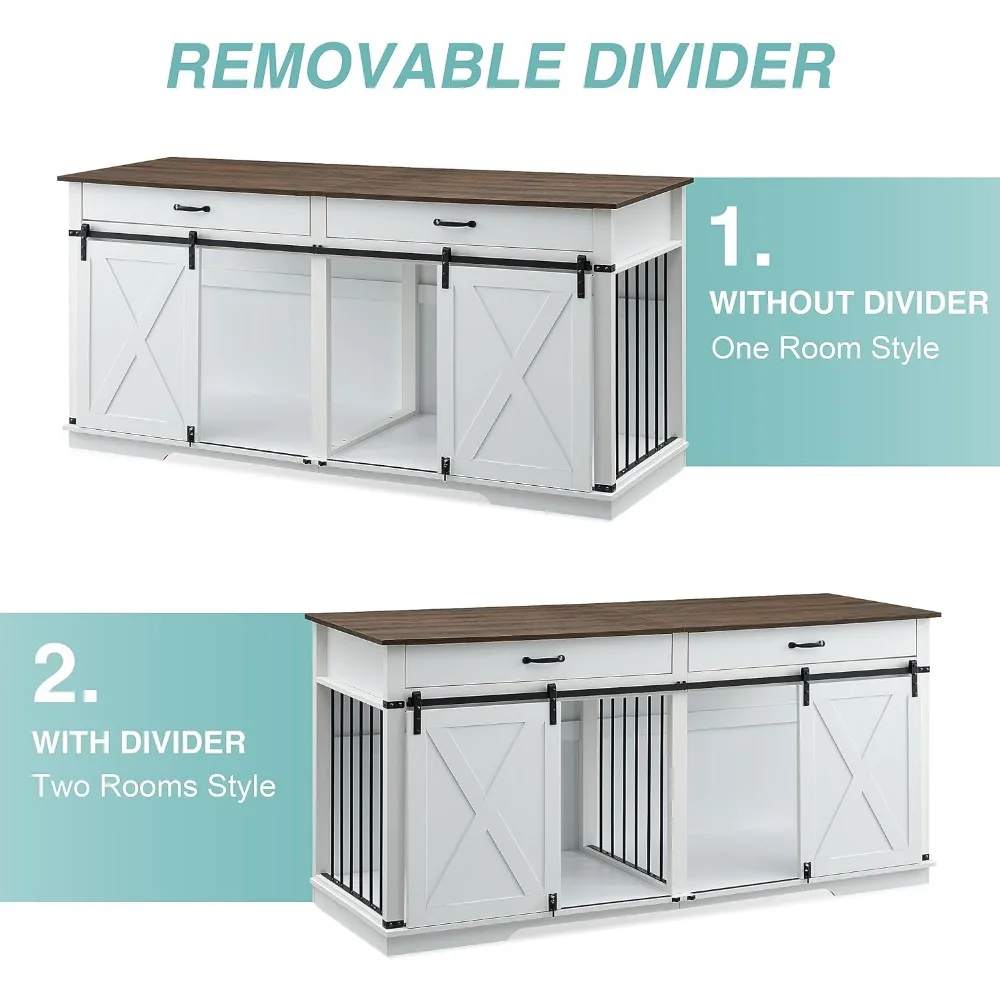 72.5" Large Dog Crate Furniture for 2 Dogs, Wooden Dog Kennel with Drawers, Divider, Sliding Barn Door, Water Resistant Indoor