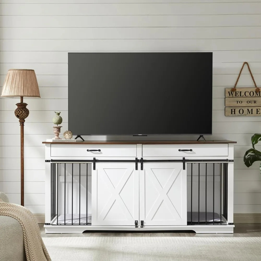 Farmhouse Furniture Style Double Dog Crates: Overall Size: 72.5"L x 23.6"W x 34.3"H. Featuring barn doors, farmhouse and bracket decor, the dog crate furniture is both modern and casual feel; minimalist design blends easily with existing interiors wherever it is placed